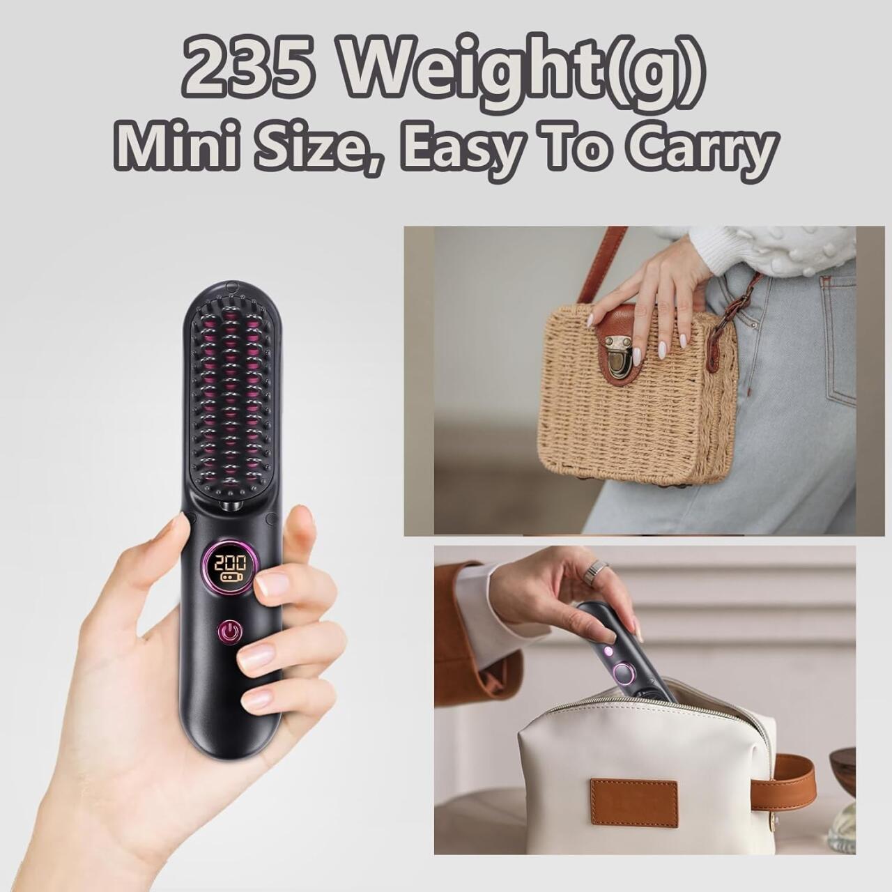 Cepillo alisador inalámbrico y portátil, ideal para llevar en tus viajes. Con un peso de solo 235 g, más ligero que una botella de agua, es cómodo de usar durante largos periodos sin cansancio. Su diseño mini y ligero lo hace perfecto para alisar tu cabello en cualquier lugar, ya sea al aire libre o en viajes de negocios.